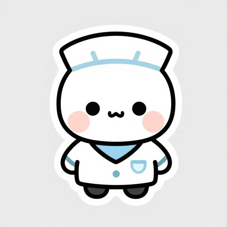 This is a digital drawing of a cute, chibi-style cartoon character resembling a nurse. The character has a round, white face with black, circular eyes and a small, smiling mouth. It has light pink blush marks on its cheeks. The nurse wears a white hat with a blue stripe and a matching white uniform with a blue neckerchief and a blue pocket. The character's arms and legs are simple black lines, and it stands against a plain white background. The overall style is minimalistic and adorable, with bold black outlines and soft, pastel colors.