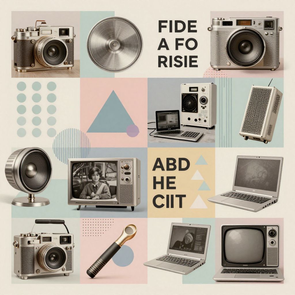 AI generated collage featuring an eclectic mix of vintage photography and modern technology icons, layered with bold typography and geometric patterns, harmonious color palette of pastels and metallics, dreamy and nostalgic ambiance, intricate and thought-provoking artwork.