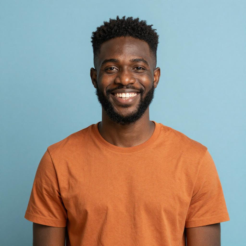 Photograph of a smiling Black man with a short, neat beard and curly hair. He's wearing an orange, short-sleeved T-shirt against a solid light blue background. His skin is a rich, dark brown, and he's looking directly at the camera with a friendly expression. The image has a clean, simple, and modern feel.