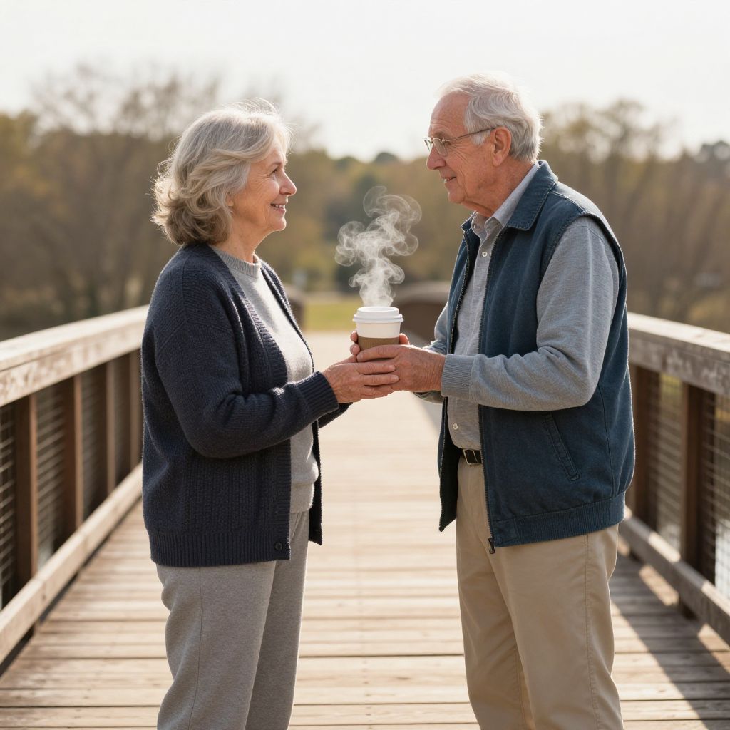 Elderly man and woman stand on a wooden bridge, sharing a moment of warmth as he offers her a steaming cup of coffee, their connection bridging the passage of time amidst a serene, sunlit backdrop.