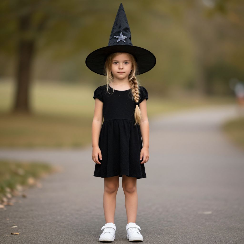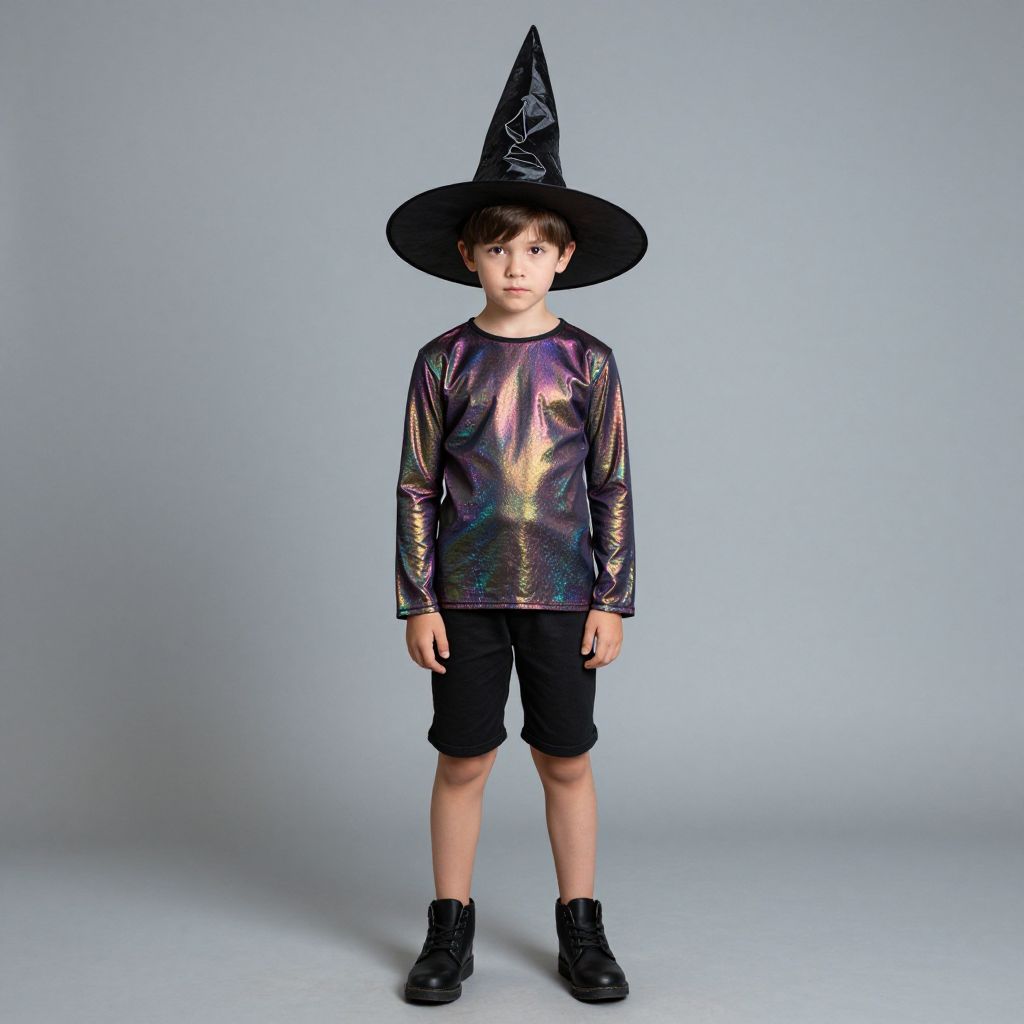 "iridescent witch costume kid, solo, hat, witch hat, standing, 1boy, looking at viewer, male focus, full body, simple background, shoes, black footwear, closed mouth, long sleeves, black headwear, arms at sides, grey background Realistic photo of casual sexy person with pretty face"