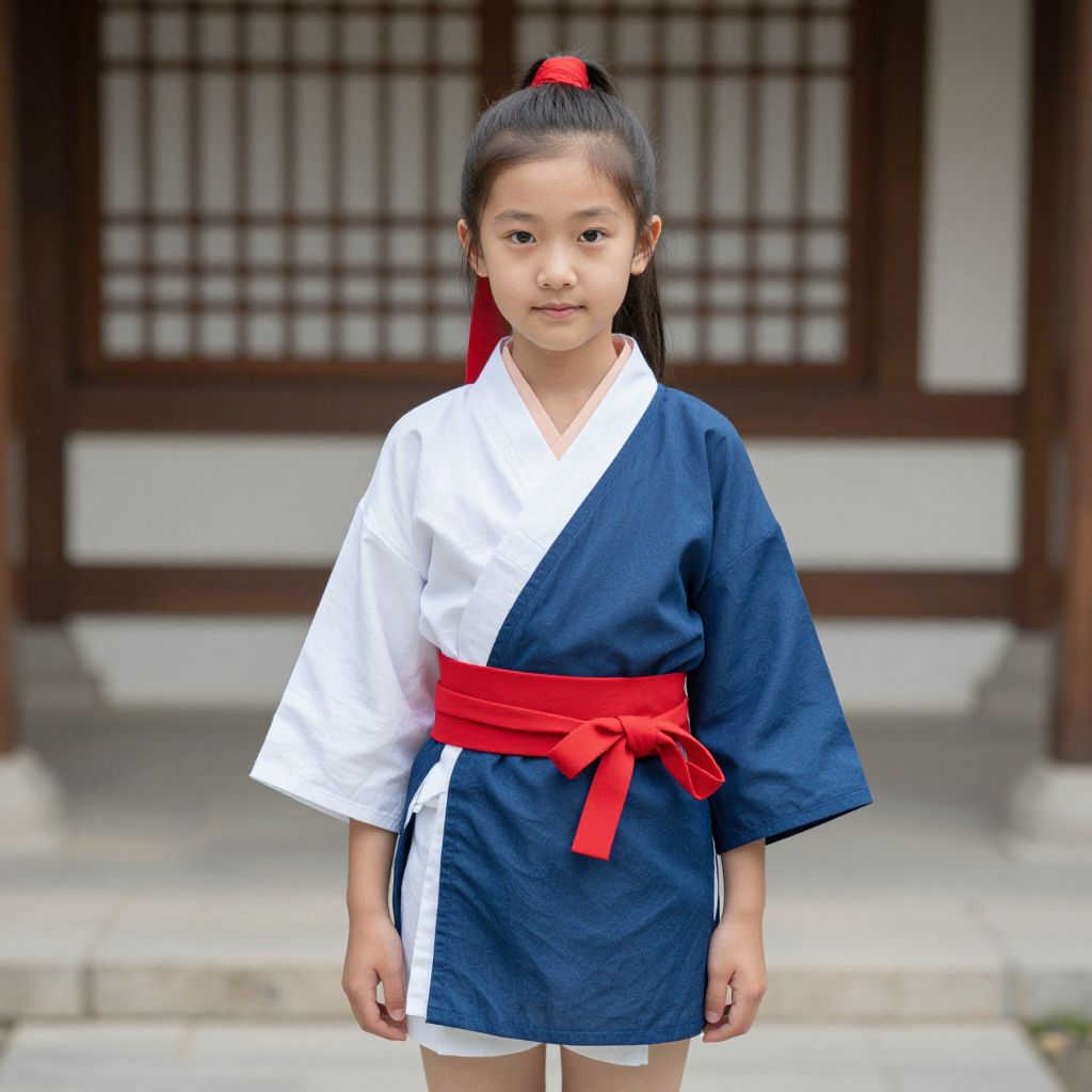 Photograph of an Asian girl with black hair in a red hairband, wearing a blue and white hakama with a red obi, standing in