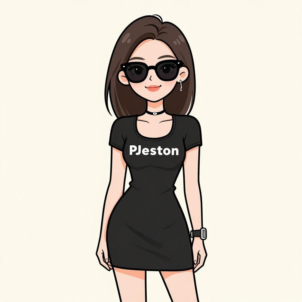 Digital drawing of a young woman with light skin and straight, dark brown hair. She wears black, cat-eye sunglasses, a black choker necklace, and a tight black t-shirt with "Peston" written in white letters. Her black mini-skirt is form-fitting, and she has a silver wristwatch on her left wrist. She has a small, red smile and her ears have silver earrings. The background is plain white, making her the focal point. The art style is cartoonish with bold lines and flat colors.