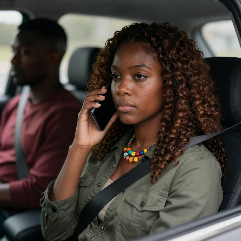 Photograph of a black woman with short curly hair, wearing a black shirt and earrings, standing against a white wall, looking at a bald black man in a white shirt, holding a coiled phone to his ear. The man is slightly turned away, focused on the phone. The background includes a partially visible door and a framed picture.
