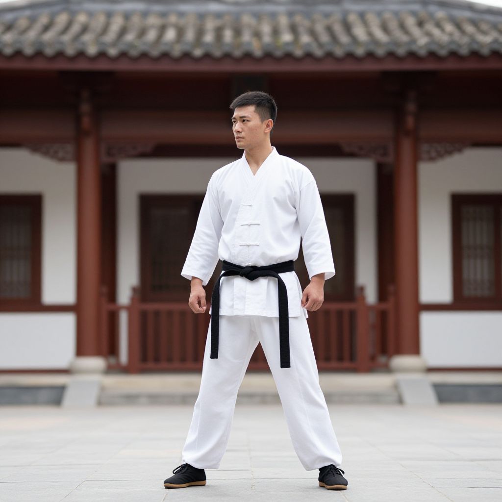"Wushu Sanda, man in traditional chinese clothing standing in front of a building"