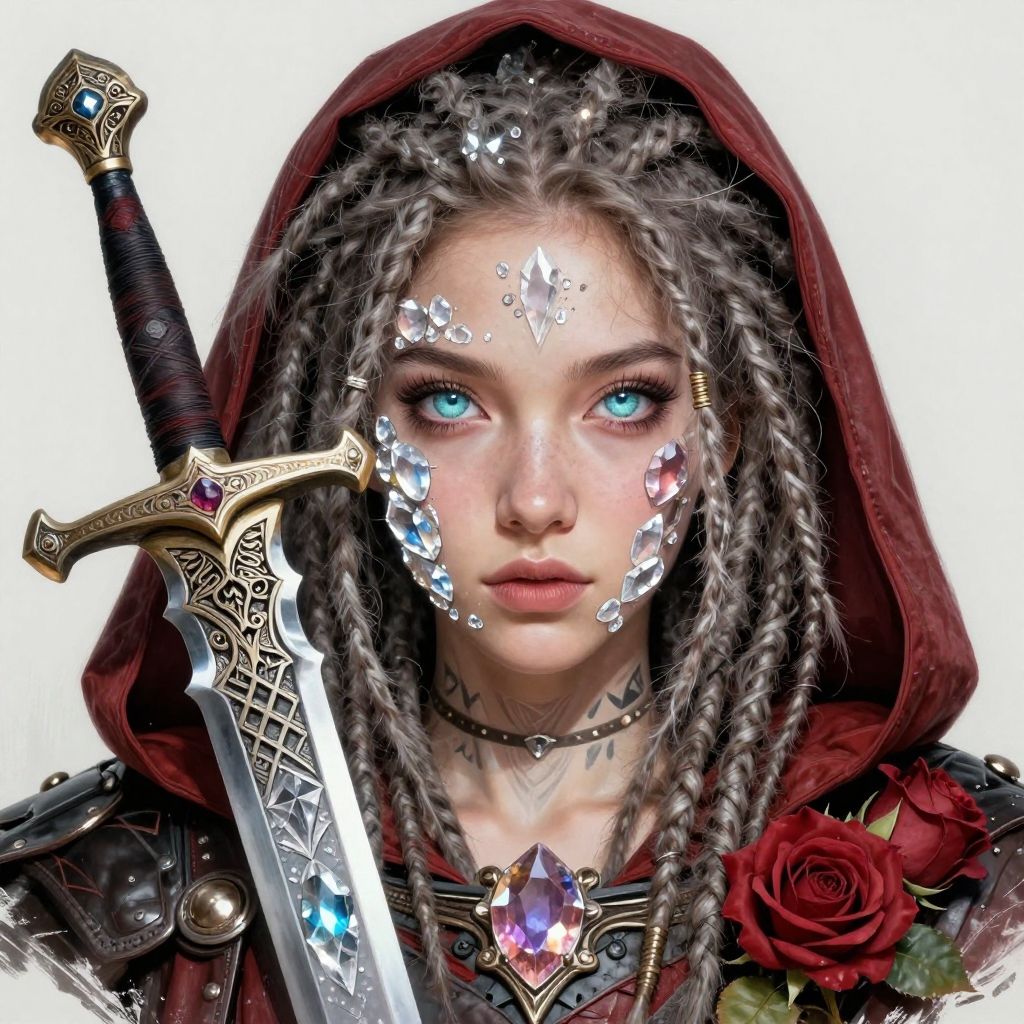 ((masterpiece, best quality, highres, realistic)) Perfect Face, technical drawing render, (a girl) made of crystal and morganite and Aster, , pained, (Headshot:0.5), ash brown dreadlocks, luminous style, detailed eyes, detailed face, Ornate Great Sword, leather armor, tribalpunk, roses, Red hooded cloak