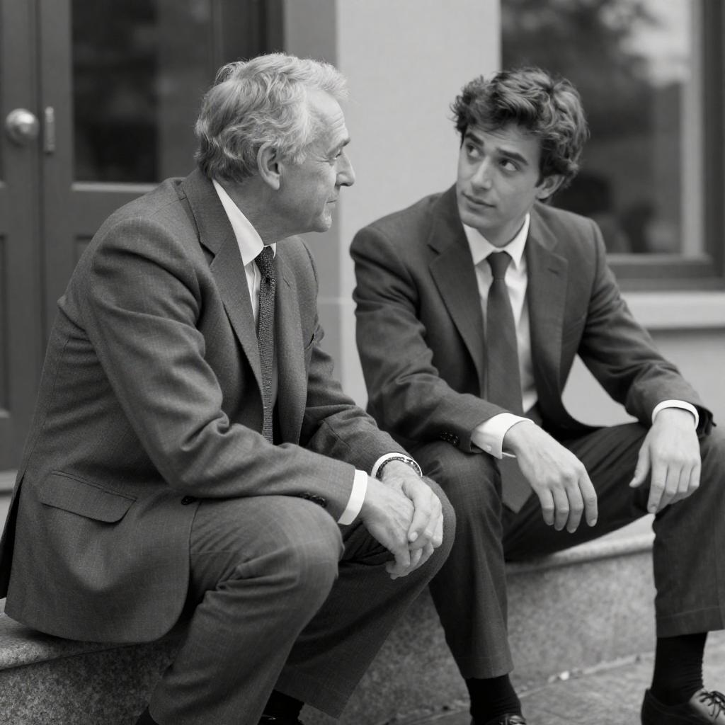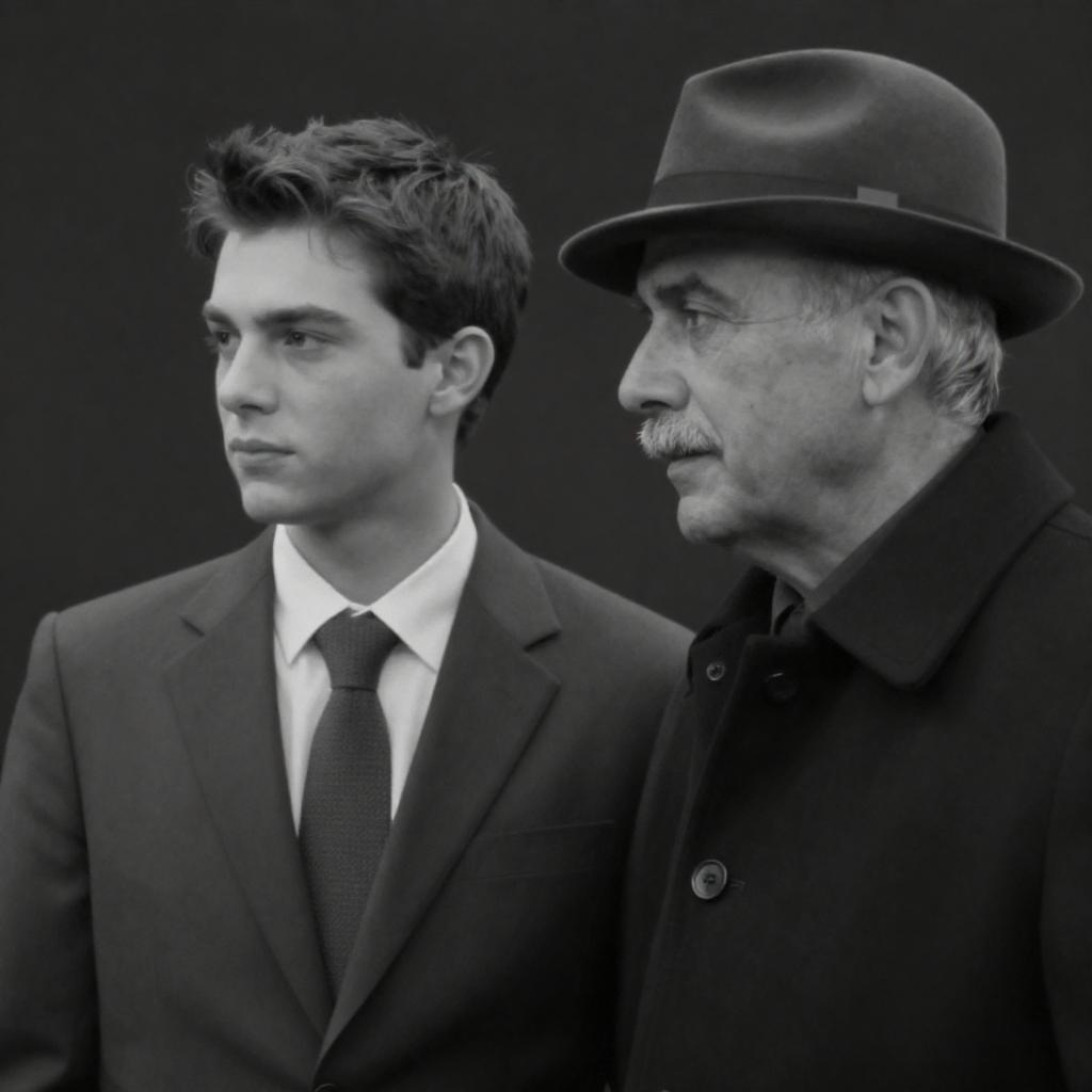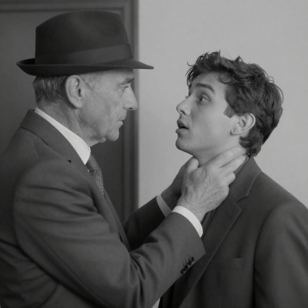 Black-and-white photograph of two men. Older man in striped shirt, patterned tie, and fedora hat. Younger man with short hair kissing older man's cheek. Older man smiling, younger man looking up. Dark background.