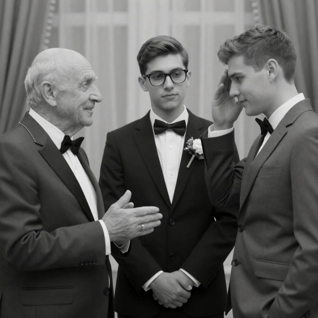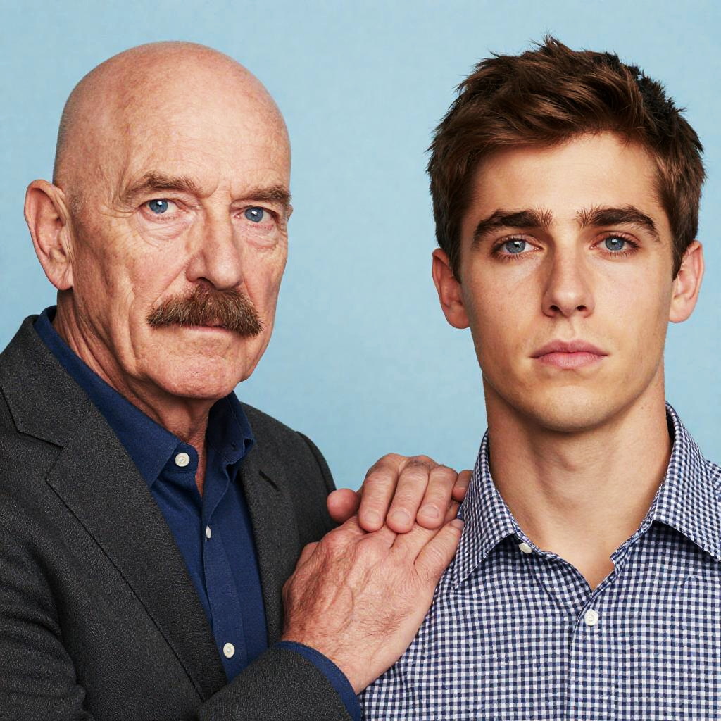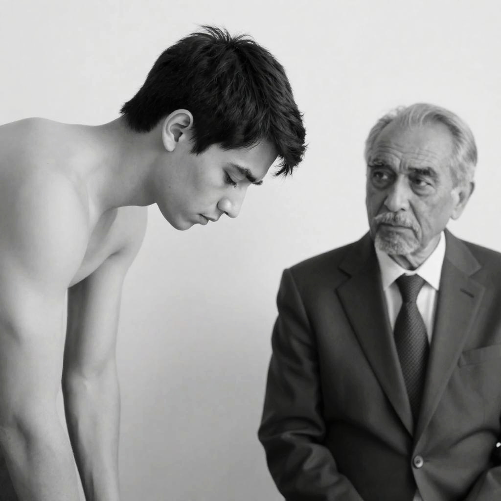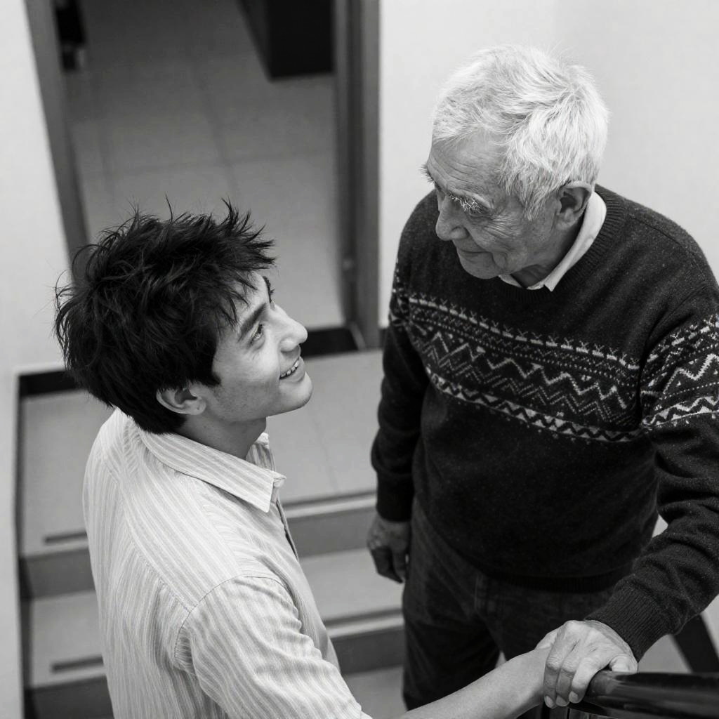 Black-and-white photograph of two men. Older man in striped shirt, patterned tie, and fedora hat. Younger man with short hair kissing older man's cheek. Older man smiling, younger man looking up. Dark background.