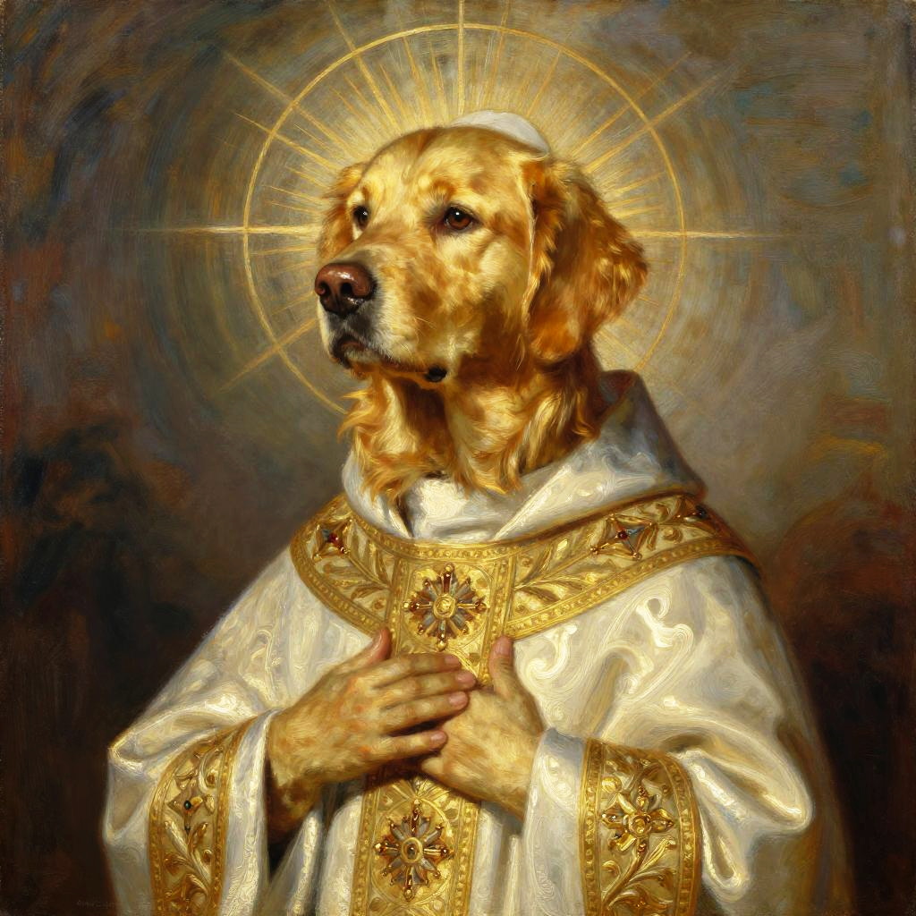 An oil painting of a holy golden retriever saint dressed in ornate Catholic priest robes, looking serenely to the left, with a radiant halo surrounding the figure and a serene expression conveying divinity, all rendered in the style of John Singer Sargent, creating a sense of ethereal beauty and rich texture.