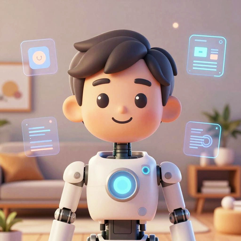 Create AI character free visualization, AI assistant avatar with friendly human-like appearance, soft pastel colors and subtle robot elements, surrounded by floating icons and holographic interfaces, futuristic smart home environment, warm lighting and inviting expression.
