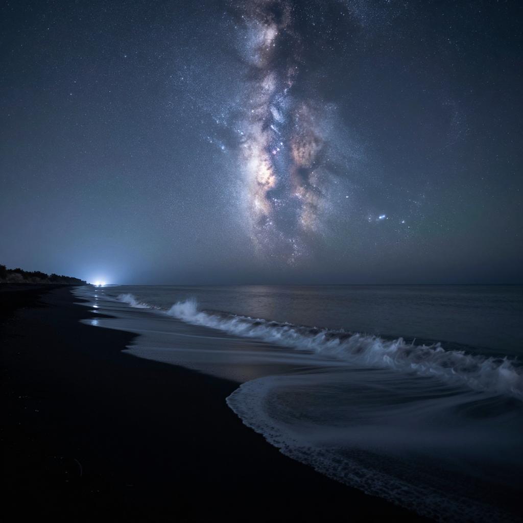 Nighttime view of a black sand beach with foamy waves gently washing ashore. The vivid Milky Way galaxy and faint northern lights stretch across the starry sky above a calm ocean, with soft glowing lights visible on the distant horizon, creating a cosmic and mysterious atmosphere.