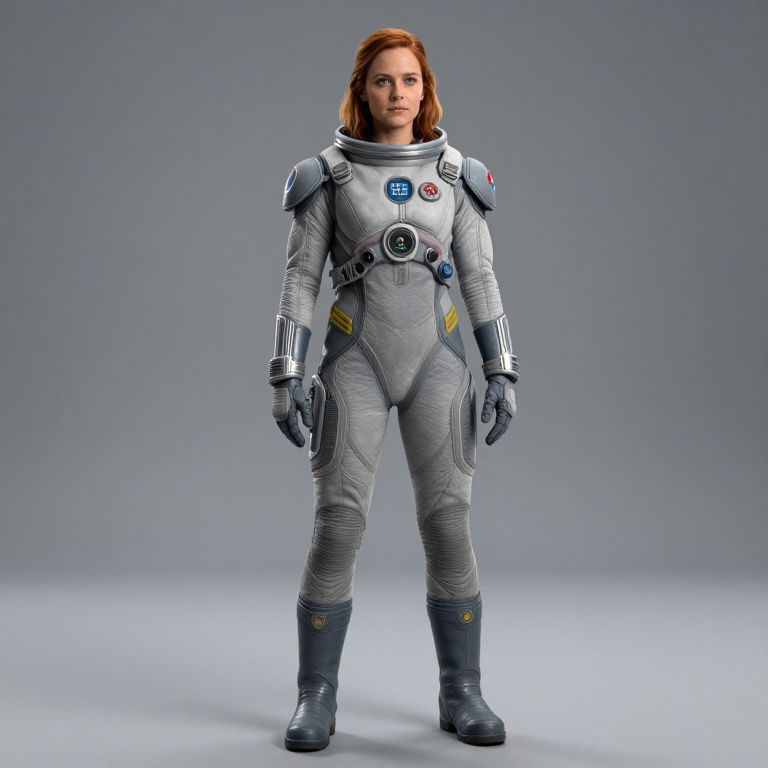"Gaffer melissa Benoist in a sci fi skin tight space suit with oxygen level display on the wrist, full body character rotation.,"