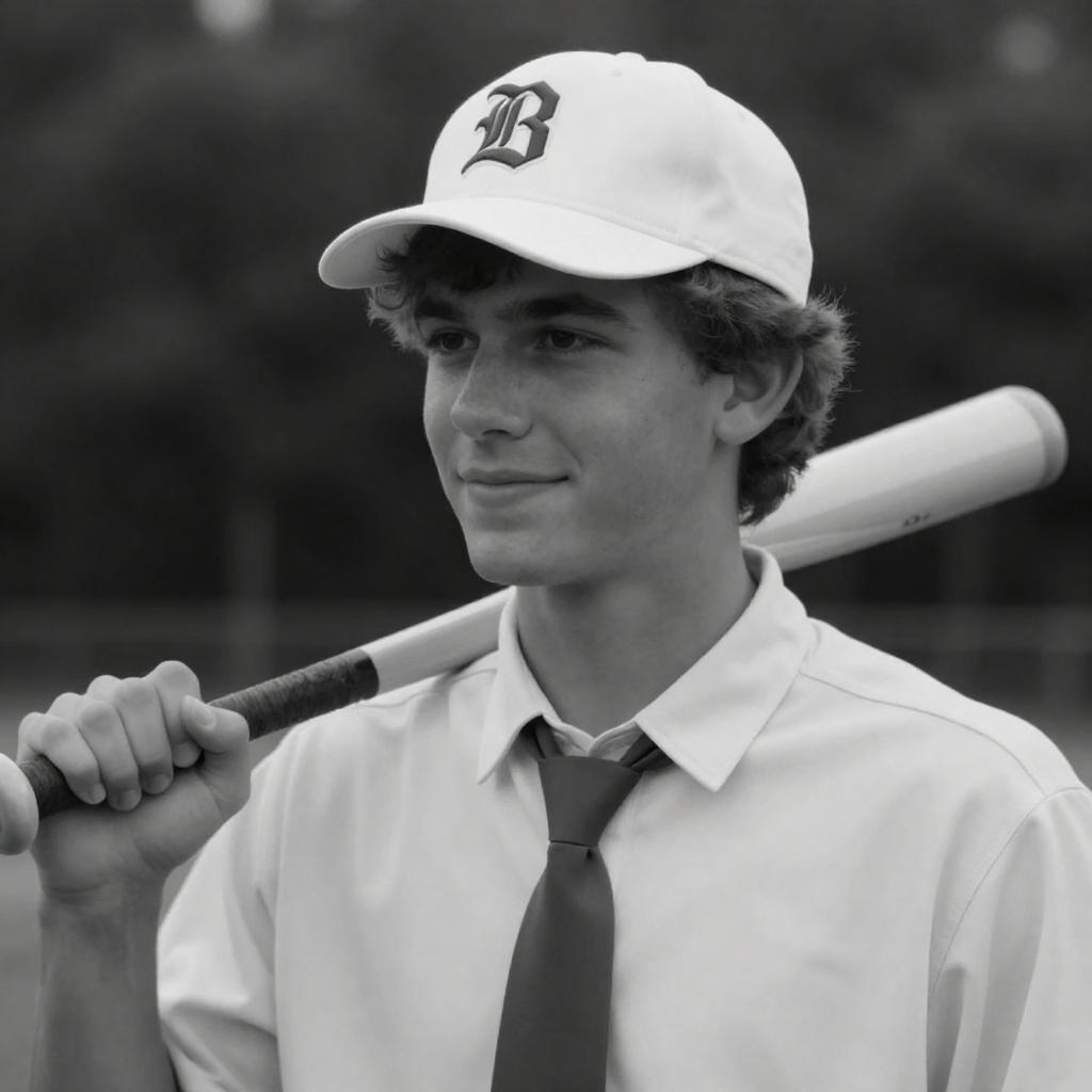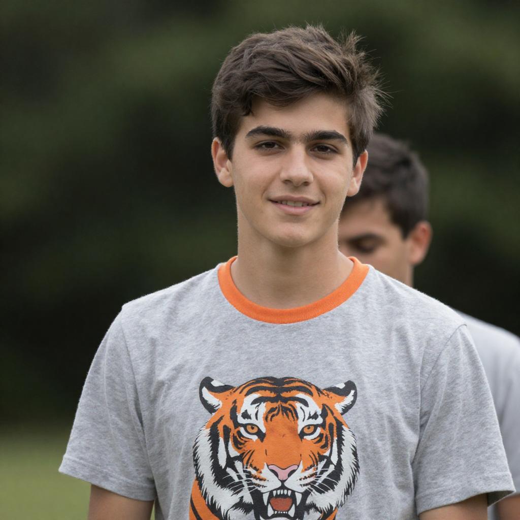 Photograph of a young man with light blonde, slightly messy hair, wearing a bright orange T-shirt with the word "Tigers" in black cursive letters. He stands outdoors in a sunlit park, hands on hips, looking to the side. Background includes blurred greenery and an orange object.