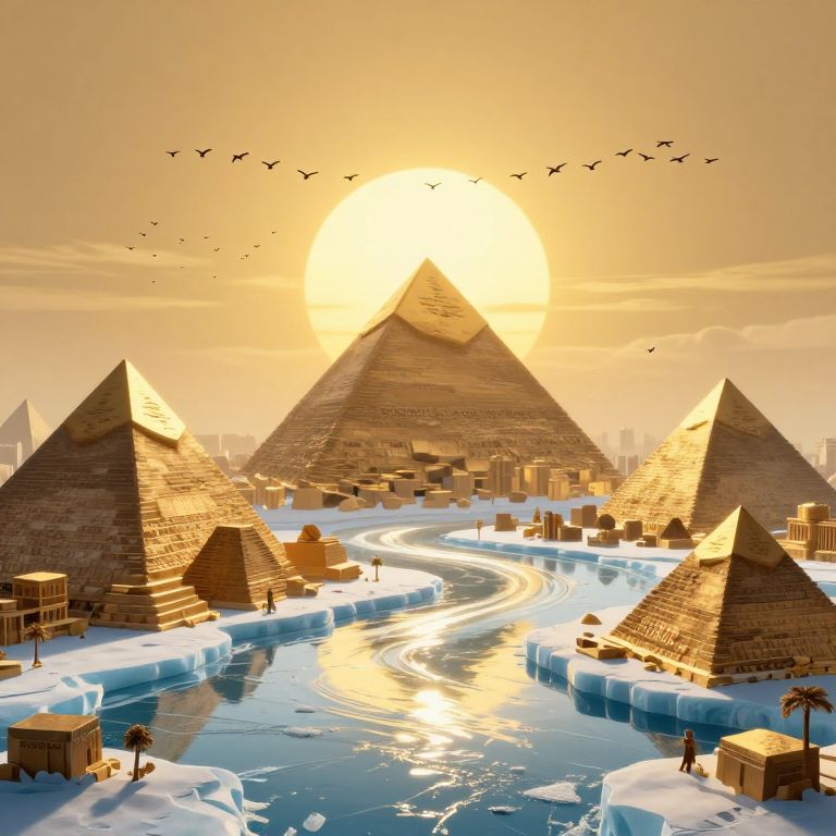 Photograph-style CGI: Sunlit pyramids with birds flying, surrounded by icy rivers, with scattered wooden crates and structures, creating a surreal ancient-E