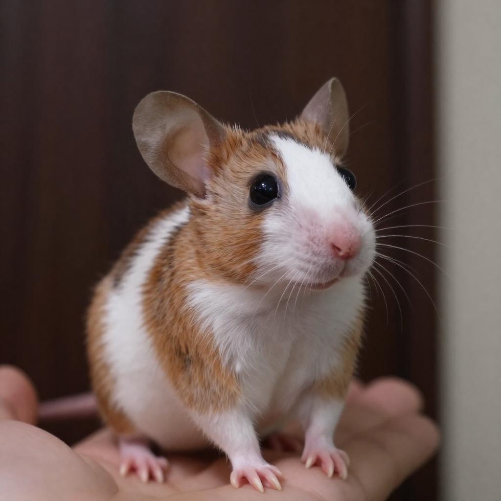 CGI mouse with brown and white fur, large pink ears, and big eyes, sitting on a hand, looking upward. Dark wooden background, ured fabric to the right. One person, intense gaze.