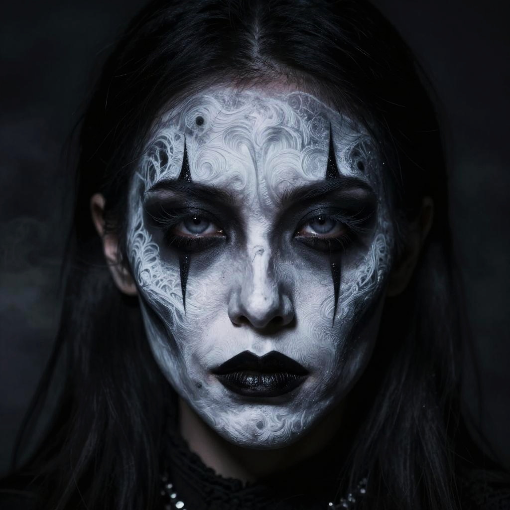 Black metal face with intense, intricate white corpse paint, sharp contrasting patterns, dark and ominous atmosphere, eerie smoky background, sharp eyes glowing faintly, gothic and mystical vibe, highly detailed cinematic portrait.