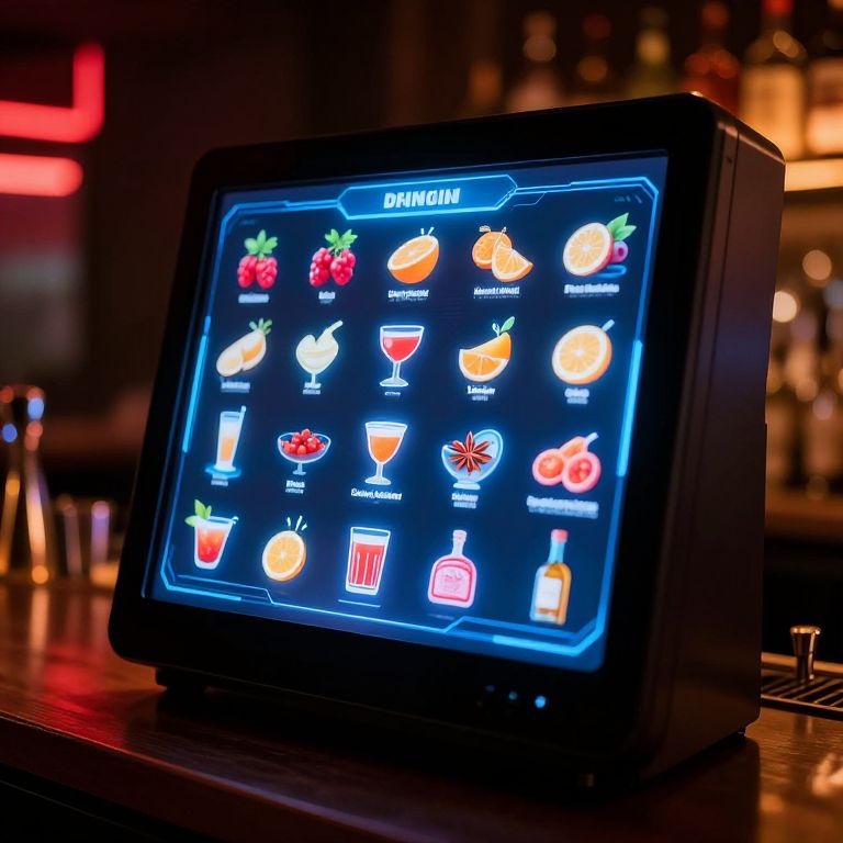 Photograph of a glowing digital drink menu display on a bar counter, showing colorful icons of various cocktails and drinks. Background is blurred with bar lights.