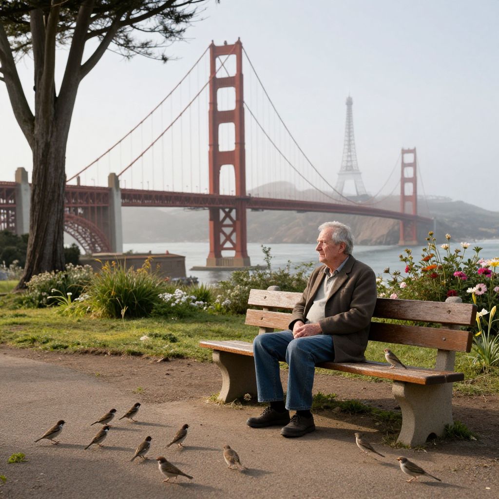 The rough texture of the asphalt fills the foreground, where a flurry of sparrows hop and peck, their tiny movements animated by the warm morning sun, The camera tilts upwards, revealing an older man seated on a worn wooden bench, his face etched with the lines of time, a picture of quiet contemplation, He is surrounded by vibrant greenery, the rustling leaves whispering secrets in the gentle breeze, Beyond this oasis of urban nature, the impossible vista unfolds: the iconic arches of the Golden Gate Bridge rise majestically against a hazy sky, while in the distance, the delicate latticework of the Eiffel Tower pierces the clouds, a whimsical anomaly, The air carries the scent of warm asphalt and blooming flowers, a sensory blend of the mundane and the extraordinary, This is a scene that defies logic, a dreamscape where geographical boundaries dissolve, evoking the surreal and thought-provoking imagery of René Magritte, infused with the playful absurdity of a child's imagination, The desired emotion is a sense of wonder and disorientation, a gentle questioning of reality, rendered with a soft, almost ethereal light to enhance the dreamlike quality of the impossible juxtaposition