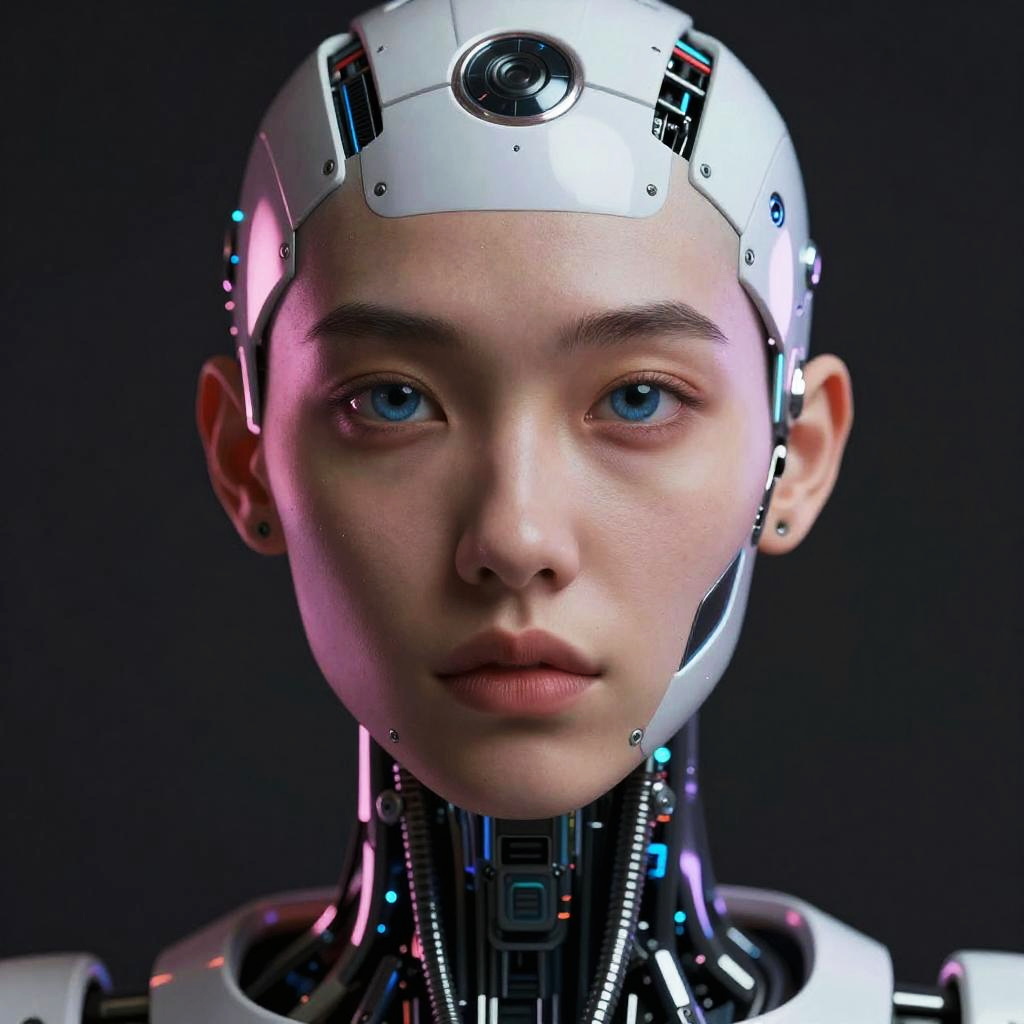 AI art, innovative portrait made by machine intelligence, blending human features with robotic and cybernetic enhancements, sharp contrasts and neon lighting, surreal and thought-provoking expression, hyper-realistic and artistic rendering