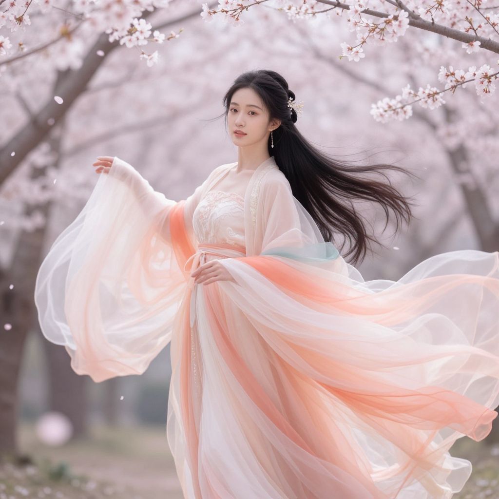 Most beautiful Asian women in the world, ethereal fantasy setting, cherry blossoms floating around, flowing silk gowns, dreamlike atmosphere, ultra-detailed and vivid colors