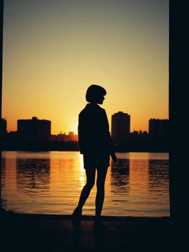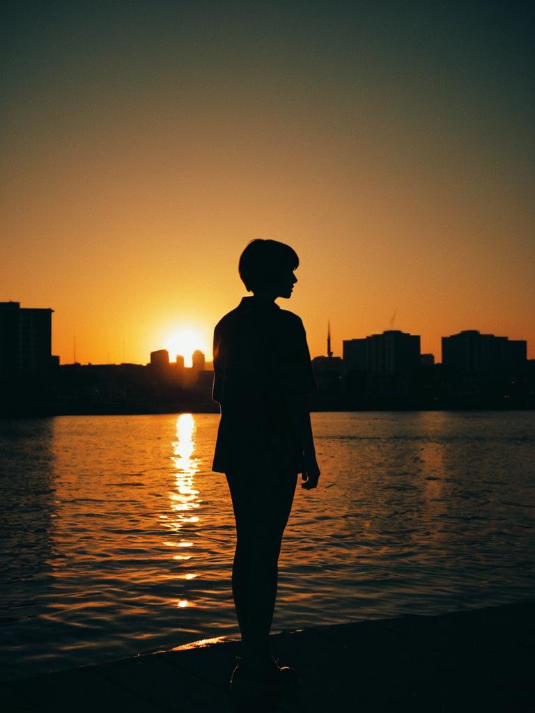 Silhouette of a woman with short hair standing and walking near a body of water during sunset. The orange sky reflects on the water surface, with city buildings in the background. The scene is backlit, creating a striking contrast between the dark figure and the bright sunset.