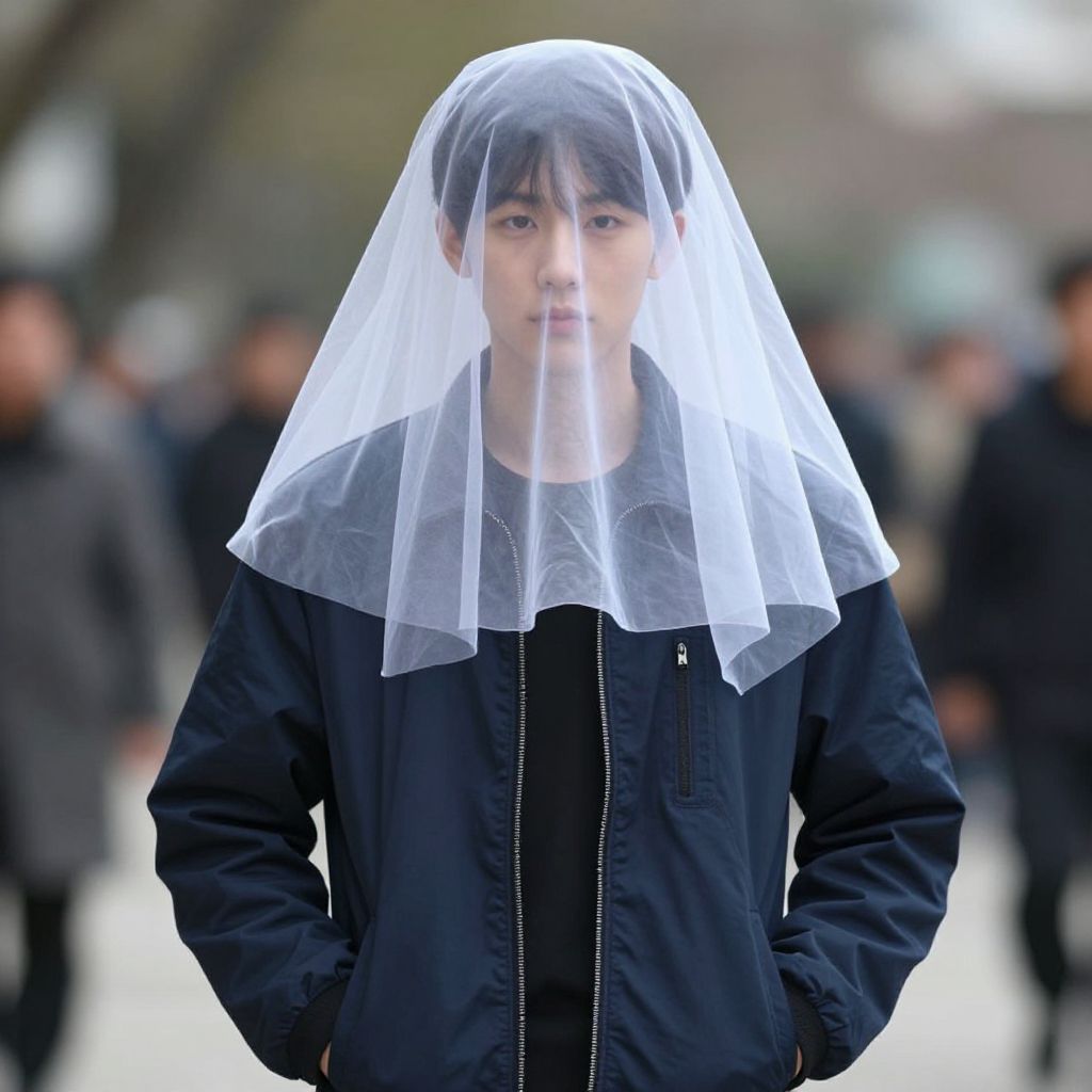 Photograph of an East Asian male standing in a blurred urban street scene. He has short black hair, fair skin, and is wearing a large brown sweatshirt that reaches mid-thigh, revealing his bare legs. He also wears brown mouse-ear headband, black boots, and a face mask. The background shows out-of-focus pedestrians, trees, and buildings. His expression is neutral, and the overall style is quirky and avant-garde. The contrast between his brown outfit and the urban setting creates a striking visual.