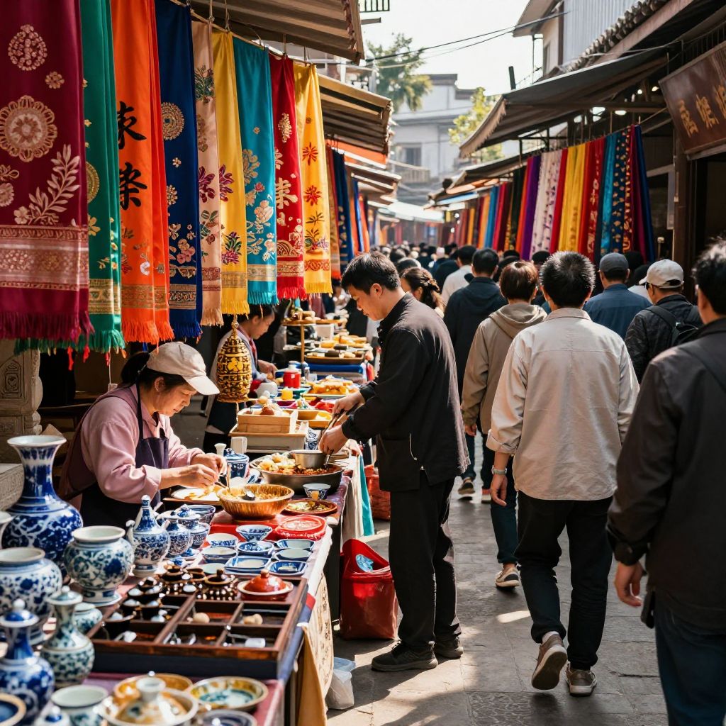 Chinese filter vibrant market scene with colorful silk fabrics, handcrafted ceramics, and traditional food stalls, bustling street with diverse crowd in traditional clothes, warm sunlight casting lively shadows, rich cultural atmosphere.