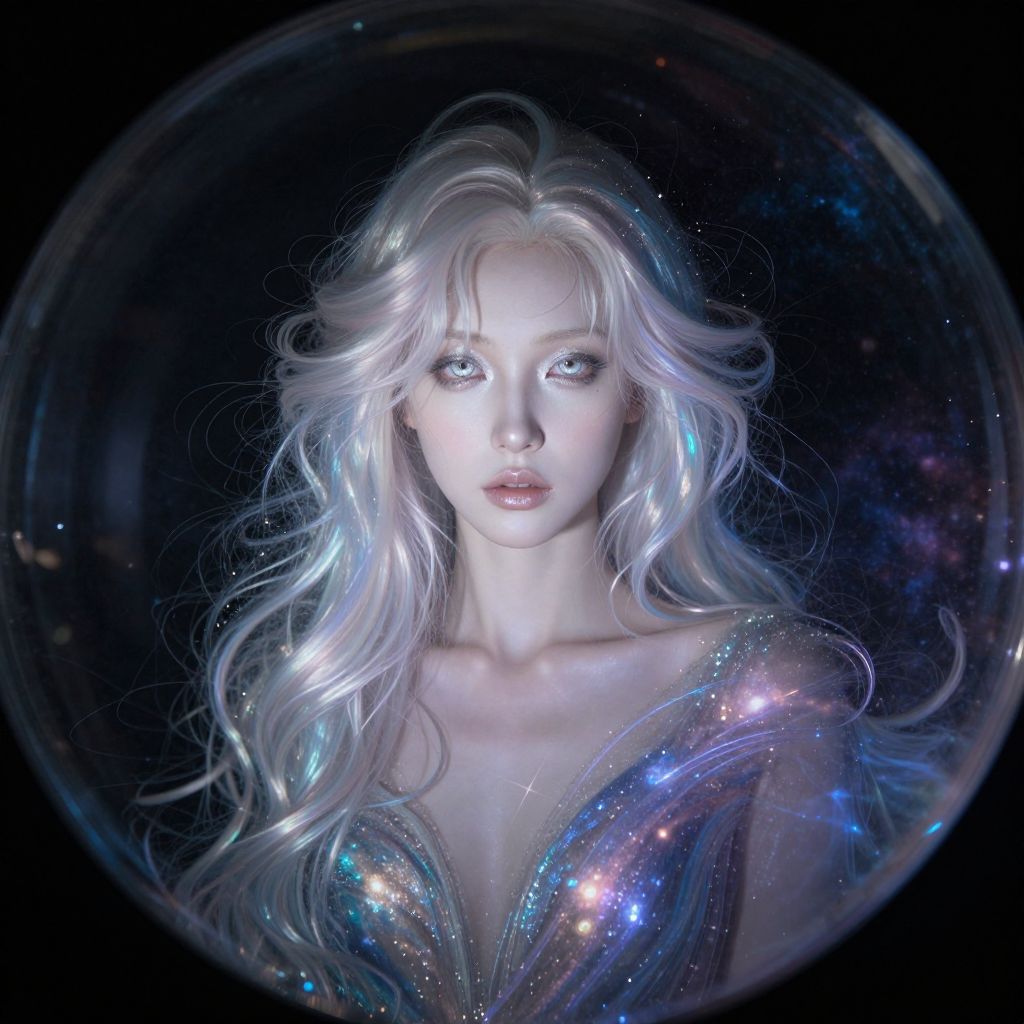Digital artwork of a pale-skinned, ethereal woman with long, flowing white hair, wearing a sparkling, galaxy-patterned top, enclosed in a