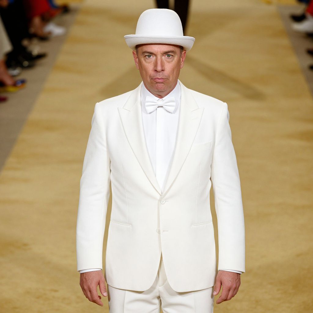 Photograph of a man in a white suit and hat, standing on a beige runway, with blurred spectators in the background.