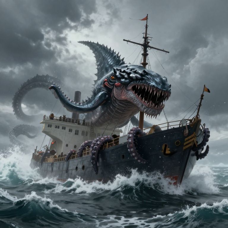 In the style of abigail larson and cgsociety, kraken attacking a large ship, tentacles wrapped around boat, rough waters, overcast, large waves, stormy seas