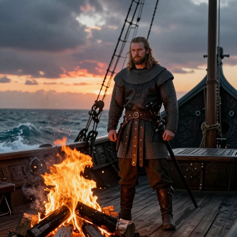 Olav, a heroic figure clad in chainmail and leather, standing beside a roaring bonfire on a Viking ship deck, the ocean waves crashing around, dramatic sunset hues, detailed environment with weathered wood and metal accents, epic composition
