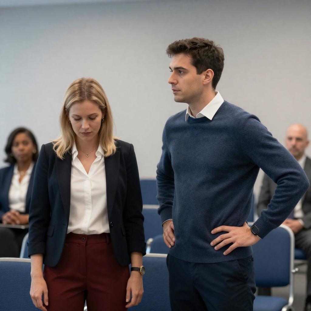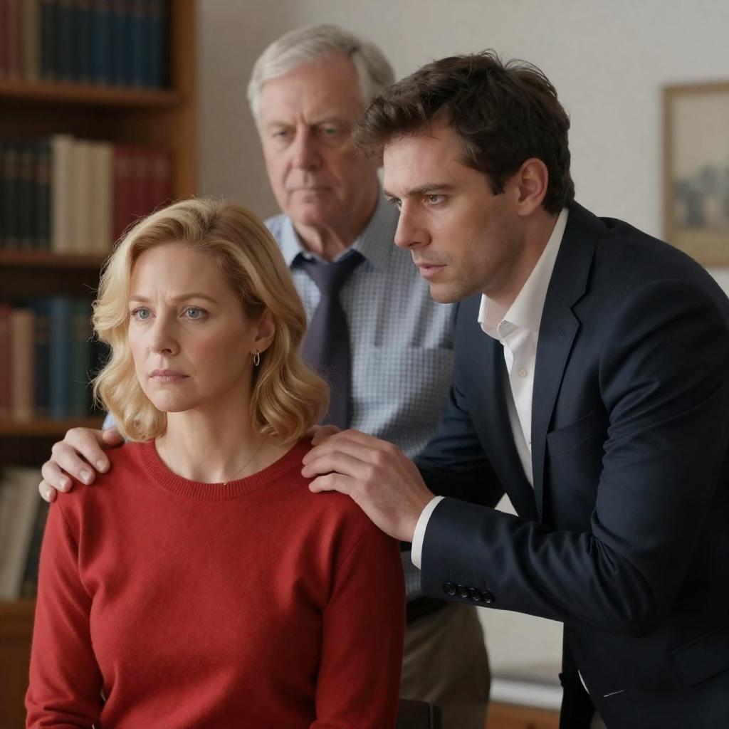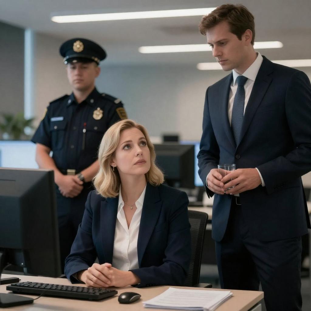 Photograph of a tense office scene: a blonde woman in a navy suit and white blouse, seated and looking up, is flanked by a standing man in a suit holding a glass, and a uniformed officer in the background. Bright office lights and computer screens create a dramatic atmosphere.
