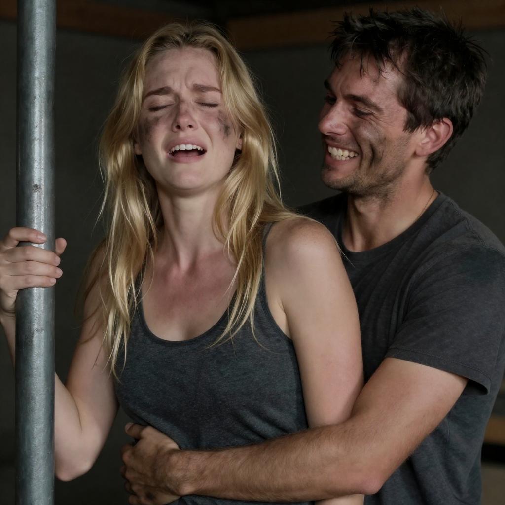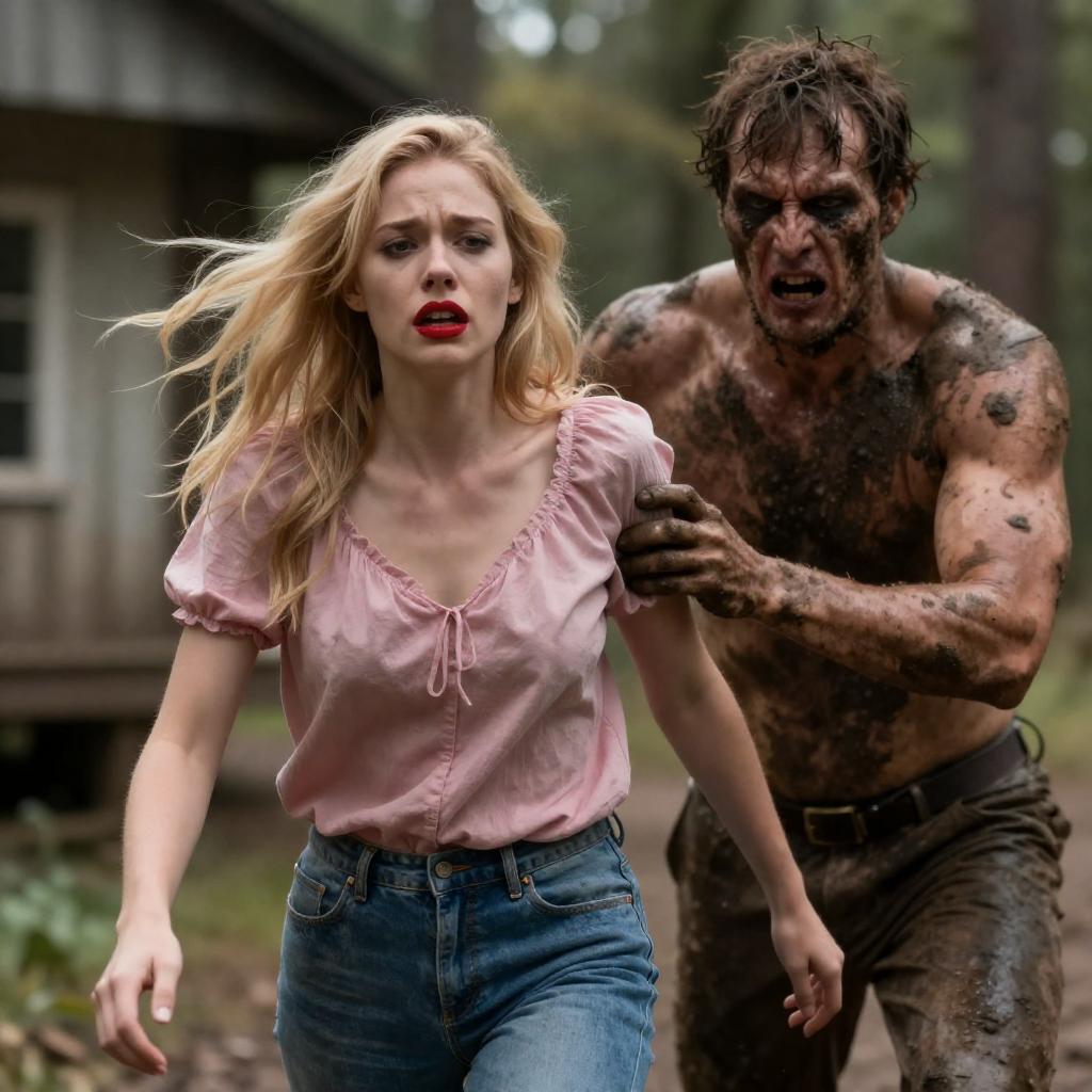 Photograph of a distressed blonde woman with red lipstick and puffy pink blouse, running from a muscular, mud-covered man with a grotesque face. Background includes trees and a blurred structure. Woman's long hair flows wildly, man's arm wraps around her shoulder. Both show intense expressions. Forest setting.