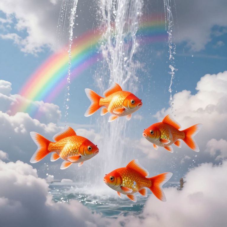 Photograph of four vibrant orange goldfish swimming in a cascading waterfall, surrounded by a bright rainbow and fluffy clouds.