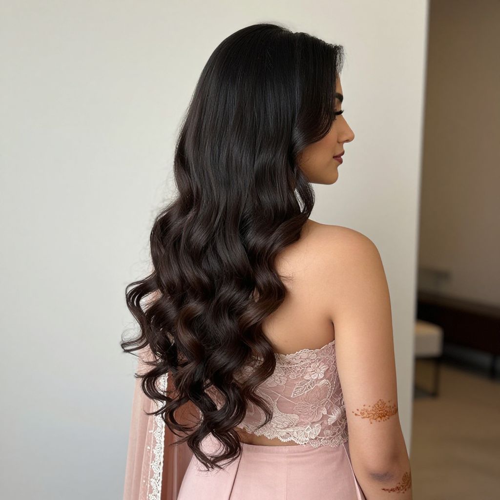 Elegant side loose waves cascade gracefully over a woman's shoulders, complementing her blush-pink lace-trimmed dress and showcasing a sophisticated mehndi day hairstyle.