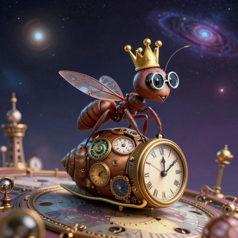 An ant wearing a tiny crown and monocle rides a runaway clockwork snail through a clockwork galaxy.