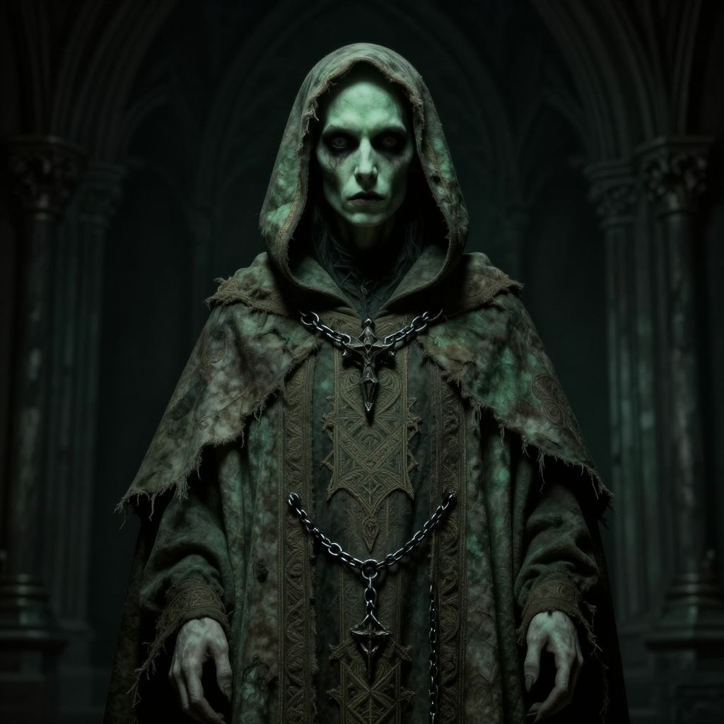 A dark, digital illustration of a pale, skeletal-faced figure standing in a gothic archway. The figure wears a tattered, hooded cloak with intricate patterns, adorned with heavy metal chains around the chest. The hood casts a shadow over the figure's face, emphasizing its hollow eyes and sunken cheeks. The background is a dimly lit, stone archway, enhancing the eerie, supernatural atmosphere. The color palette is dominated by dark greens and blues, adding to the ominous mood. The figure's expression is stern and foreboding, suggesting a sense of power and menace.