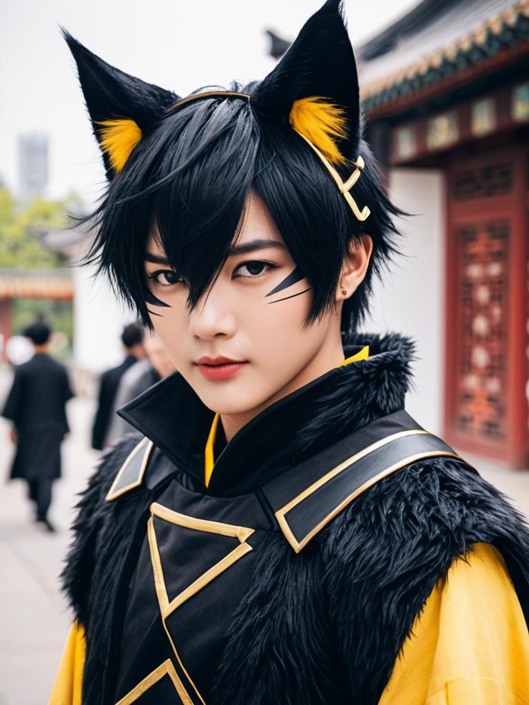Photo-realistic cosplay photo of person in aak (arknights) costume. 1boy, furry male, cat boy, cat ears, ear piercing, tail, animal ears, yellow eyes, slit pupils, hair over one eye, black hair, short hair, chinese clothes, black nails, yellow scleralifestyle stock photo, shallow depth of field, lifestyle stock photography, shallow depth of field, natural lighting, warm tones, soft background blur, candid moments, vibrant colors, realistic textures, modern casual clothing. full body shot