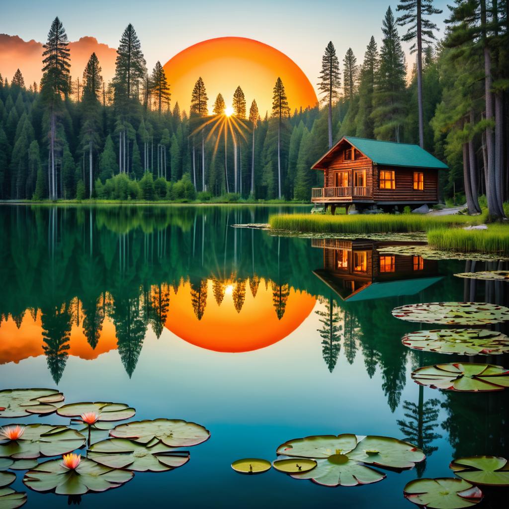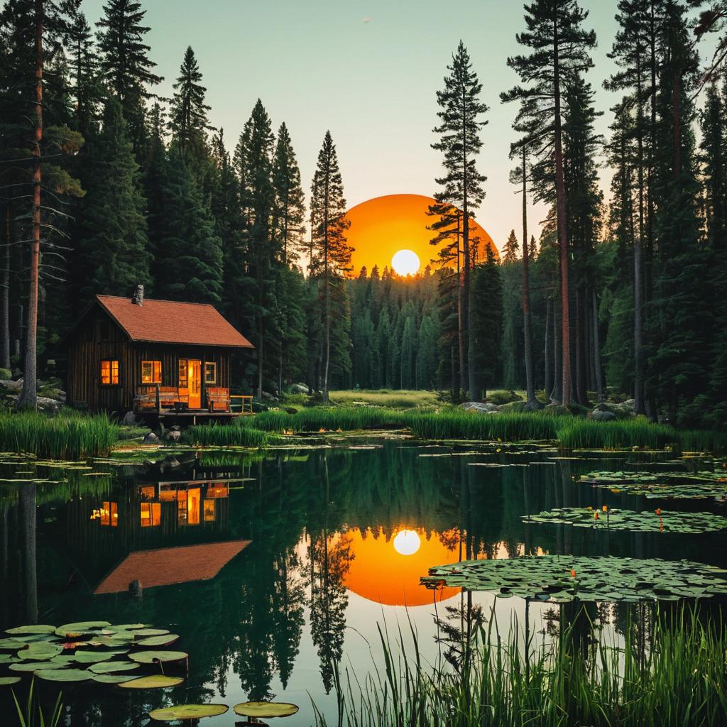 A serene landscape featuring a large glowing orange sun setting behind a dense forest of tall pine trees, a reflective greenish lake in the foreground with water lilies, a small rustic cabin on the shore across the lake, and a lone figure standing on a rocky outcrop by the water, peaceful natural environment, painterly style, warm orange and green color scheme