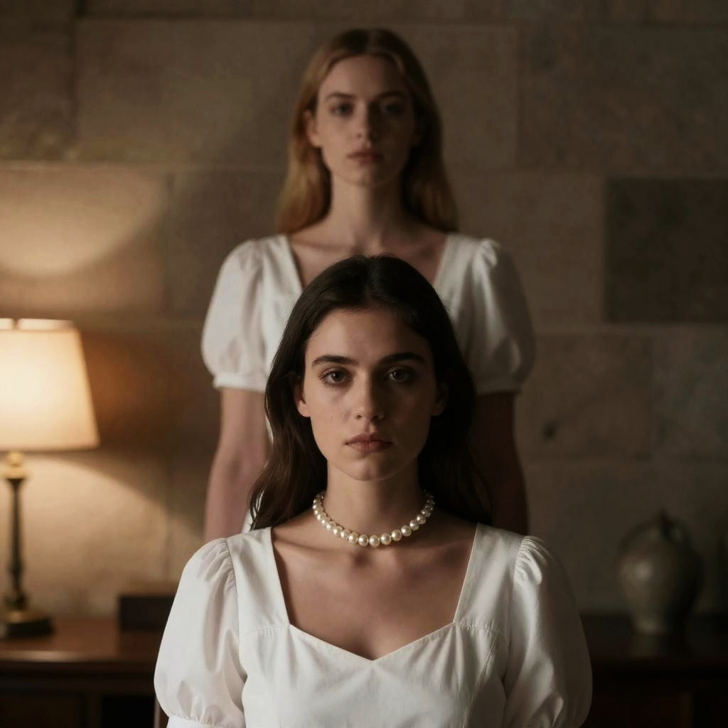 Photograph of two women with light brown hair, seated back-to-back. Both wear light-colored, ured dresses with puffy sleeves. The woman on the right has a stern expression, arms crossed. The background is a ured, earthy wall.