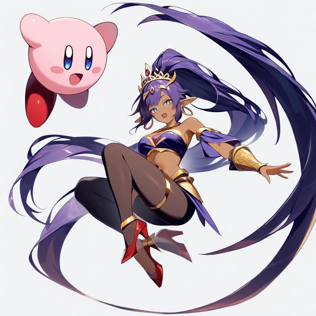 N_pokemon, multiple girls, green headwear, hat, green hair, brown hair, dress, blonde hair, shorts, multiple crossover, skirt, gloves, long hair, simple background, crossover, white background, green eyes, black hair, pointy ears, pokemon creature, jewelry, smile, jacket, holding, tiara, short hair
