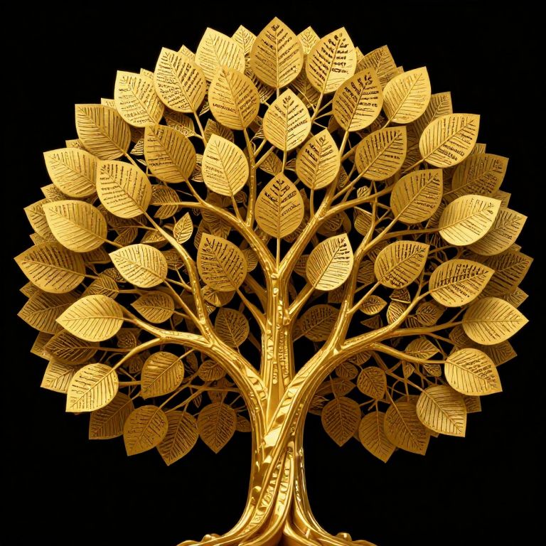 Digital artwork of a golden tree with intricately detailed leaves, set against a black background. The tree's vibrant gold color and textured leaves create a striking