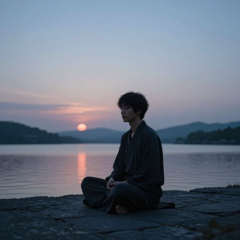 Kagami Hirotaka meditating on a stone terrace overlooking a lake at twilight, barefoot, eyes closed, a faint glow from the setting sun on the water, minimalist composition, atmospheric depth, serene and introspective mood, MidJourney style.