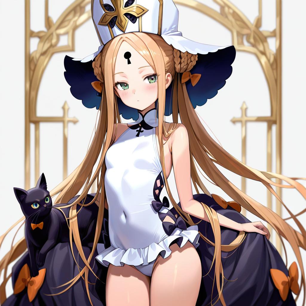 Abigail williams (swimsuit foreigner) (second ascension) (fate), fate/grand order, 1girl, blue eyes, blonde hair, very long hair, parted bangs, sidelocks, double bun, twintails, braided bun, small breasts, thighs, covered navel, white one-piece swimsuit, dress swimsuit, white headwear, bare shoulders, orange bow, black bow, multiple bows, forehead, black cat, keyhole, mitre, white hat, by artist freng, illustrious