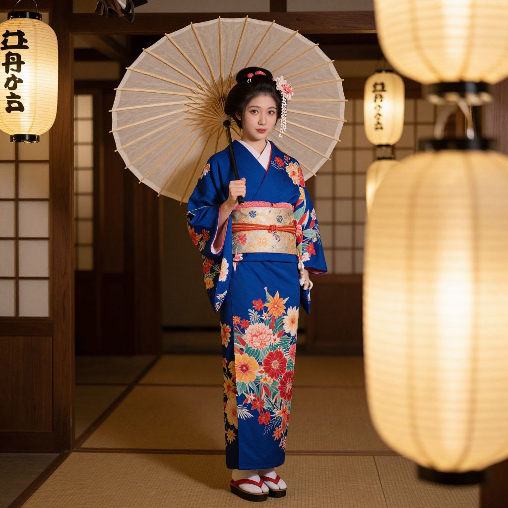 Geisha costume party, japanese clothes, kimono, umbrella, hair ornament, hair flower, flower, 1girl, solo focus, oil-paper umbrella, black hair, looking at viewer, standing, lantern, sash, full body, realistic, paper lantern, blurry, tabi, blue kimono, sandals