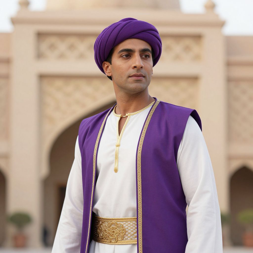 Purple Vest Man Aladdin, man in a purple turban standing in front of a building