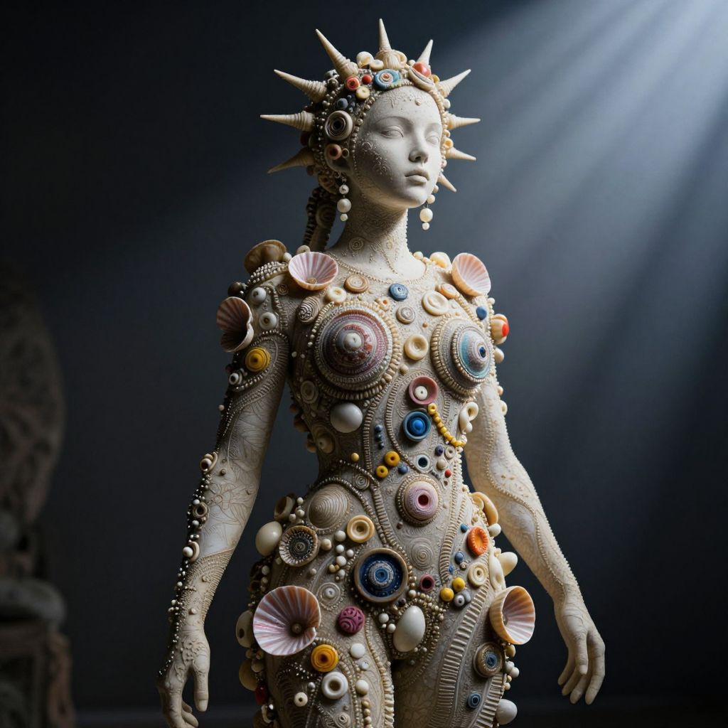 A hyperrealistic, photorealistic sculpture of a woman adorned with intricate, shell-like decorations and a dramatic, god-ray lighting effect, reminiscent of the works of Joel-Peter Witkin, Yayoi Kusama, Wassily Kandinsky, and Ernst Haeckel, with a stop-motion, focal-point effect and dramatic lighting.