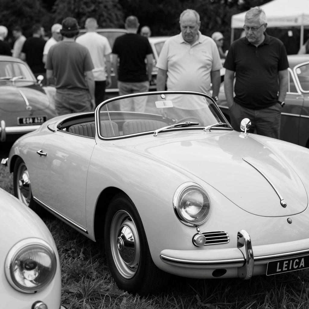Freelance A photograph of a Porsche 356 spyder at a 1930’s car show, convey a sense of emotion and intimacy, capturing the emotional depth, Unconventional angles and perspectives creating a unique view that highlights the beauty and complexity of the subjects, Light and shadow are masterfully utilized to create depth and atmosphere carefully crafted to create balance and harmony, paying close attention to the placement of the subjects, background, and foreground telling a story, capturing a moment in the lives of the subjects and allowing the viewer to connect with them on a deeper level, black and white, leica very realistic, HD,