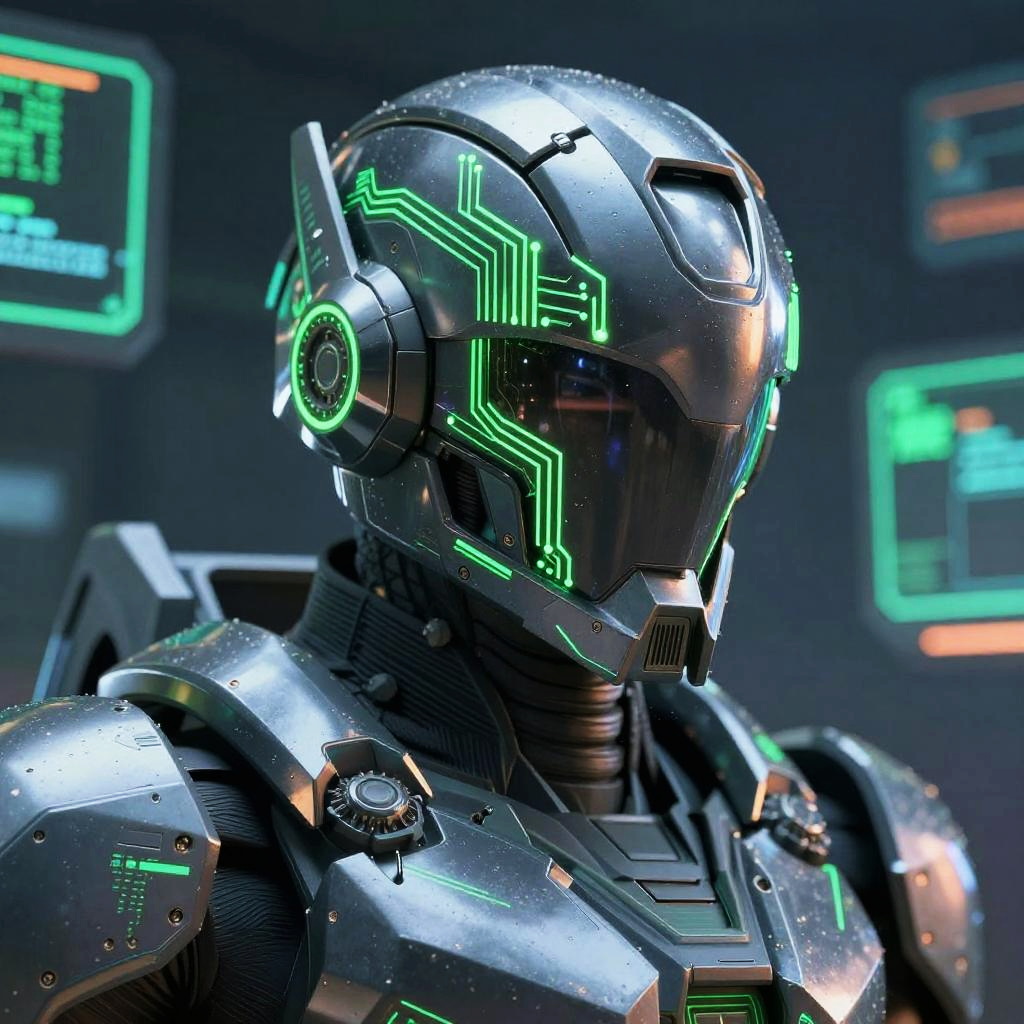 Green pfp showcasing a futuristic avatar with luminous green cybernetic eyes and neon circuitry patterns on the face, set against a dark background with glowing green accents, ideal for a sci-fi or gaming profile picture, highly detailed and dynamic.