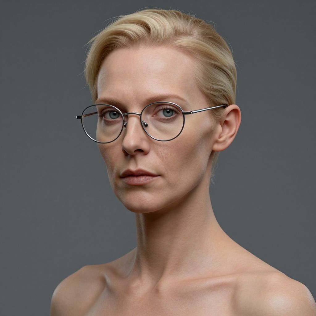 Photograph of a fair-skinned, blonde-haired woman with short, sleek hair wearing round, wire-frame glasses, and no shirt, against a solid